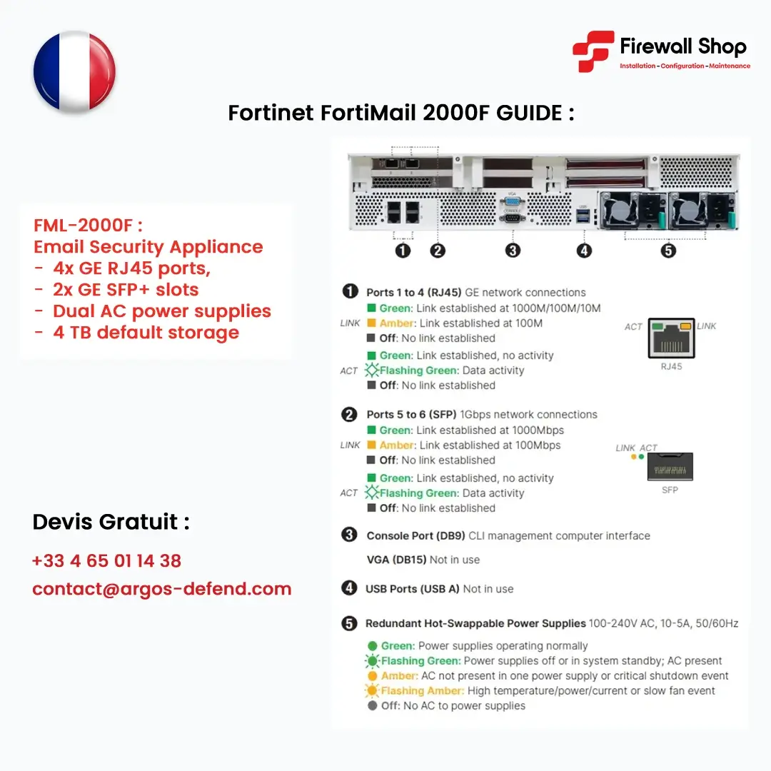 R : Le FortiMail 2000F est une appliance de sécurité email haut de gamme conçue pour les grandes organisations (banques, opérateurs telecom, institutions publiques). Il protège contre le spam, le phishing, les ransomwares et les fuites de données, avec une capacité de traitement de 8 millions de messages/jour.